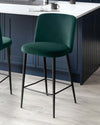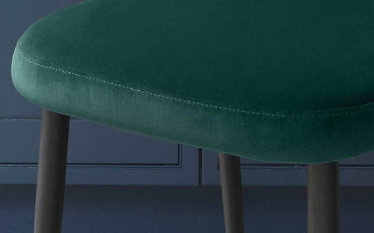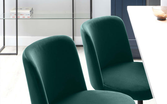 The Trinny dark green velvet bar stool brings rich colour and cushioned comfort to your kitchen island or breakfast bar. Upholstered in plush velvet with a gently curved bucket seat, it offers support where you need it most. The sleek metal legs and fixed height design make this an effortless addition to any modern kitchen or dining space.
