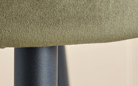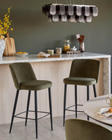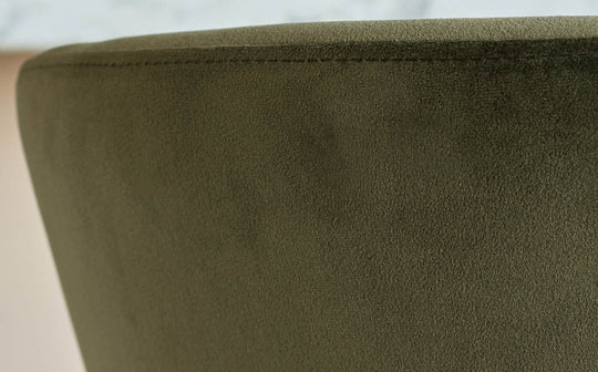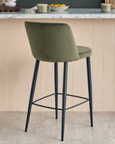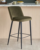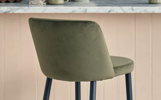 The Trinny olive green velvet bar stool brings sustainable sophistication to your breakfast bar or kitchen island. Upholstered in sumptuous recycled velvet, this fixed-height stool combines comfort with conscience. The slim powder-coated steel frame provides sturdy support, while the curved backrest and padded seat make morning coffee or evening drinks a pleasure.