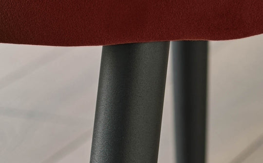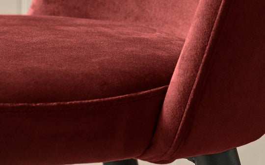 The Trinny toffee red velvet dining chair brings sophisticated colour and comfort to your dining space. Upholstered in plush recycled velvet with a rich toffee red hue, these chairs make a bold statement while remaining versatile enough for any dining setting. The slim powder-coated metal frame adds industrial flair, while the cushioned seat and curved backrest ensure comfortable dining experiences. Sold in pairs.
