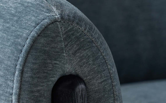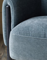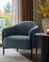 The Tristan accent chair brings sophisticated comfort to any corner of your home. Upholstered in heritage blue-grey fabric with a beautifully rounded silhouette, this chair features curved armrests that flow seamlessly from the back. The sleek black wood legs provide a striking contrast, making it perfect for creating a cosy reading nook or adding extra seating to your living room.