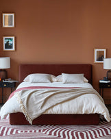 A double bed with a russet coloured headboard and base, with bedside tables either side. Pictures hang on the wall above.