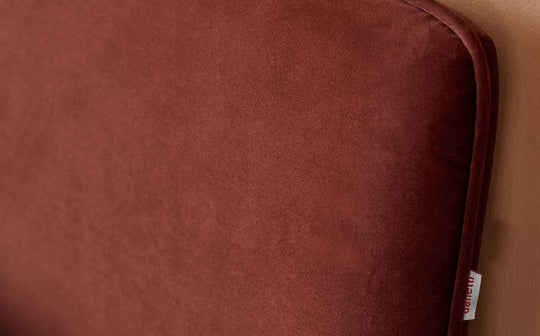 • Rich toffee red recycled velvet upholstery