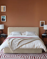 A plush beige bedhead, soft bedding with satin pillows, and a sleek black bedside table complement a warm-toned wall.