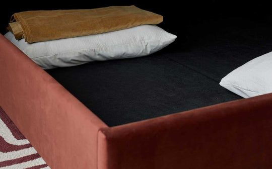 The Turin red recycled velvet king size ottoman storage bed brings together sophisticated style and clever storage in one beautifully designed piece. Its luxuriously padded headboard creates the perfect backdrop for reading or relaxing, while the hidden ottoman compartment beneath keeps bedding and seasonal essentials organised and out of sight. Upholstered in rich, sustainable recycled velvet, this bed makes a striking statement.