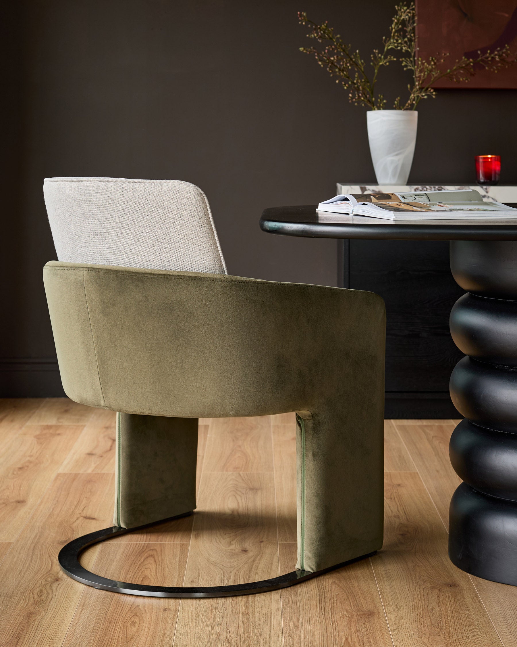 Thoughtfully designed for real life, the Wren natural fabric and olive green velvet black steel cantilever dining chair brings modern sophistication to your dining space. The recycled velvet backrest flows seamlessly into an integrated upholstered leg, while the natural dual-tone fabric seat adds gentle texture. Perfect for lingering dinners and meaningful conversations around your table.
