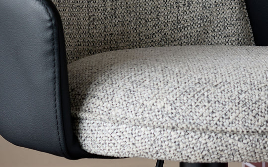 The Wren gas lift bar stool brings sophisticated comfort to kitchen islands and breakfast bars. Its salt & pepper chunky chenille seat offers a soft, tactile surface for morning coffees, while the black Durosoft faux leather backrest wraps around to create subtle armrests. The smooth gas-lift mechanism adjusts from 56-82cm, making it perfect for counters of any height.