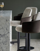 Stylish bar stools with dark arms and marble bar, plus a stemmed glass of white wine. Luxe and modern.