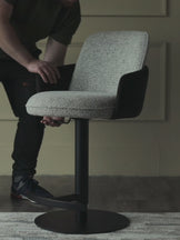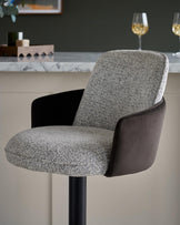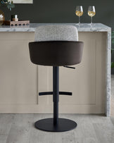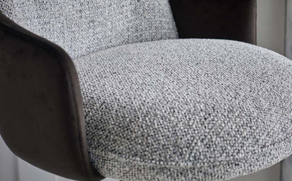 The Wren gas lift bar stool brings sophisticated comfort to your kitchen island or breakfast bar. Its unique layered design combines grey salt-and-pepper woven fabric with soft dark chocolate recycled velvet, creating visual interest from every angle. The smooth gas-lift mechanism adjusts from counter to bar height, while curved armrests and a supportive backrest make lingering over morning coffee a pleasure.