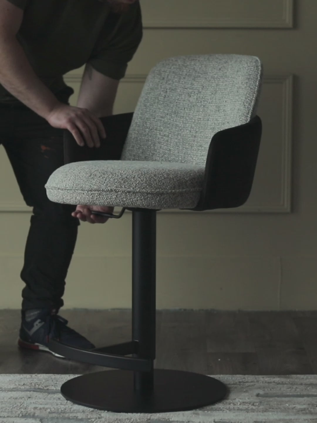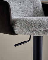 Close-up of a stylish bar stool with a textured grey seat, sleek black frame and height adjustment lever.