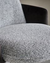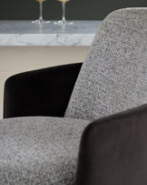Close-up of a textured grey chair with dark brown armrests, showcasing quality craftsmanship and modern design.