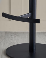 Close-up of the base of a stylish black bar stool with a round base, metal footrest and sturdy central column.