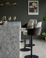 Two stylish bar stools with plush brown seats and patterned backs sit beneath a marble-topped counter and lighting fixture.