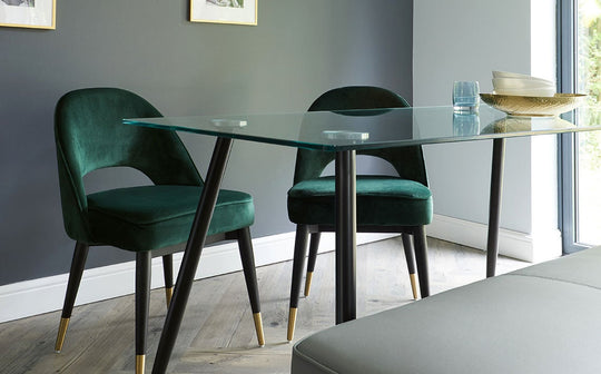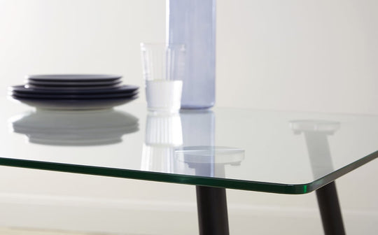 Instantly elevate your dining space with the Zilo black and glass 6-seater dining table. Its sleek rectangular tempered glass top adds a touch of modern luxury while creating an open and airy feel. The angled, black powder-coated steel legs provide a striking contrast, completing the contemporary look with designer detailing and added durability, thanks to the built-in floor protectors. This versatile dining table sits perfectly in various settings, from modern to minimalist interiors. Pair it with colourful upholstered dining chairs for a bold statement, or opt for a sleek dining bench for a more casual and relaxed dining experience. Add a statement pendant light and some greenery to complete the look.Details