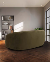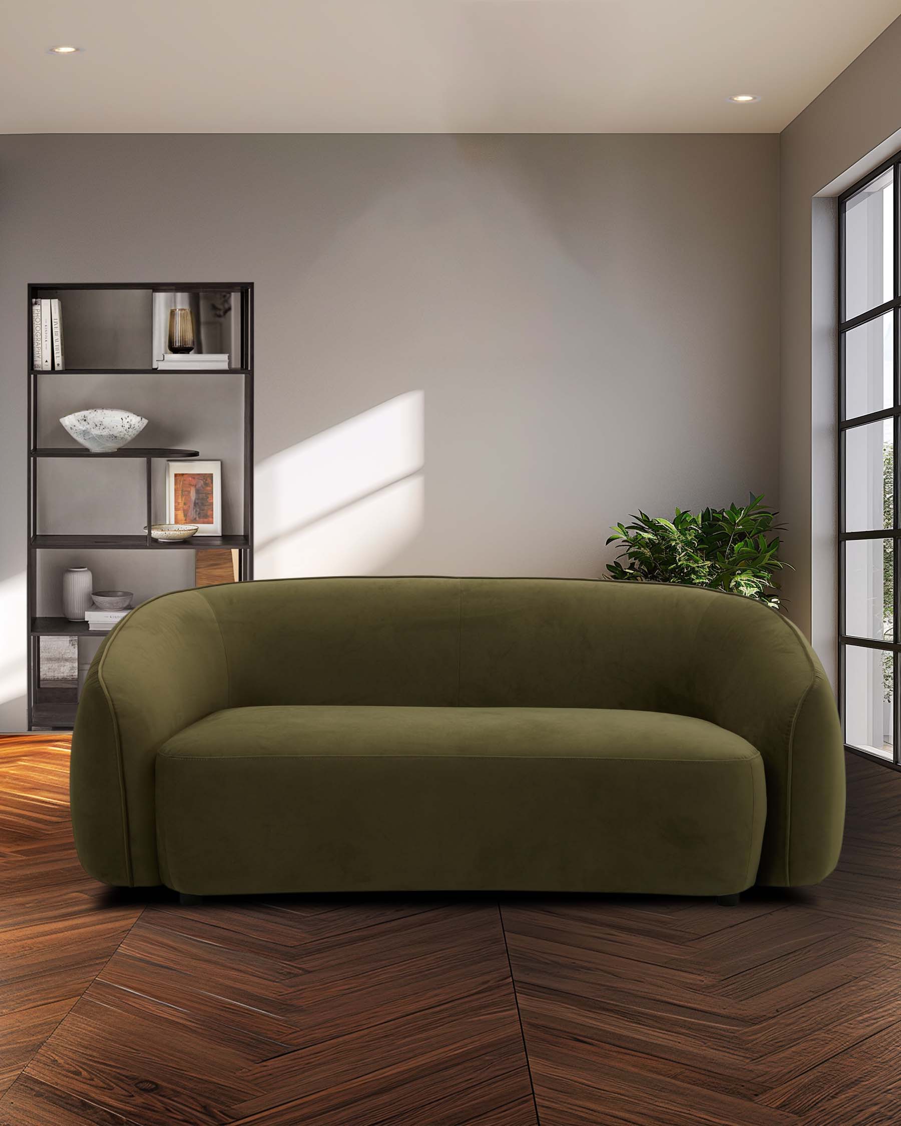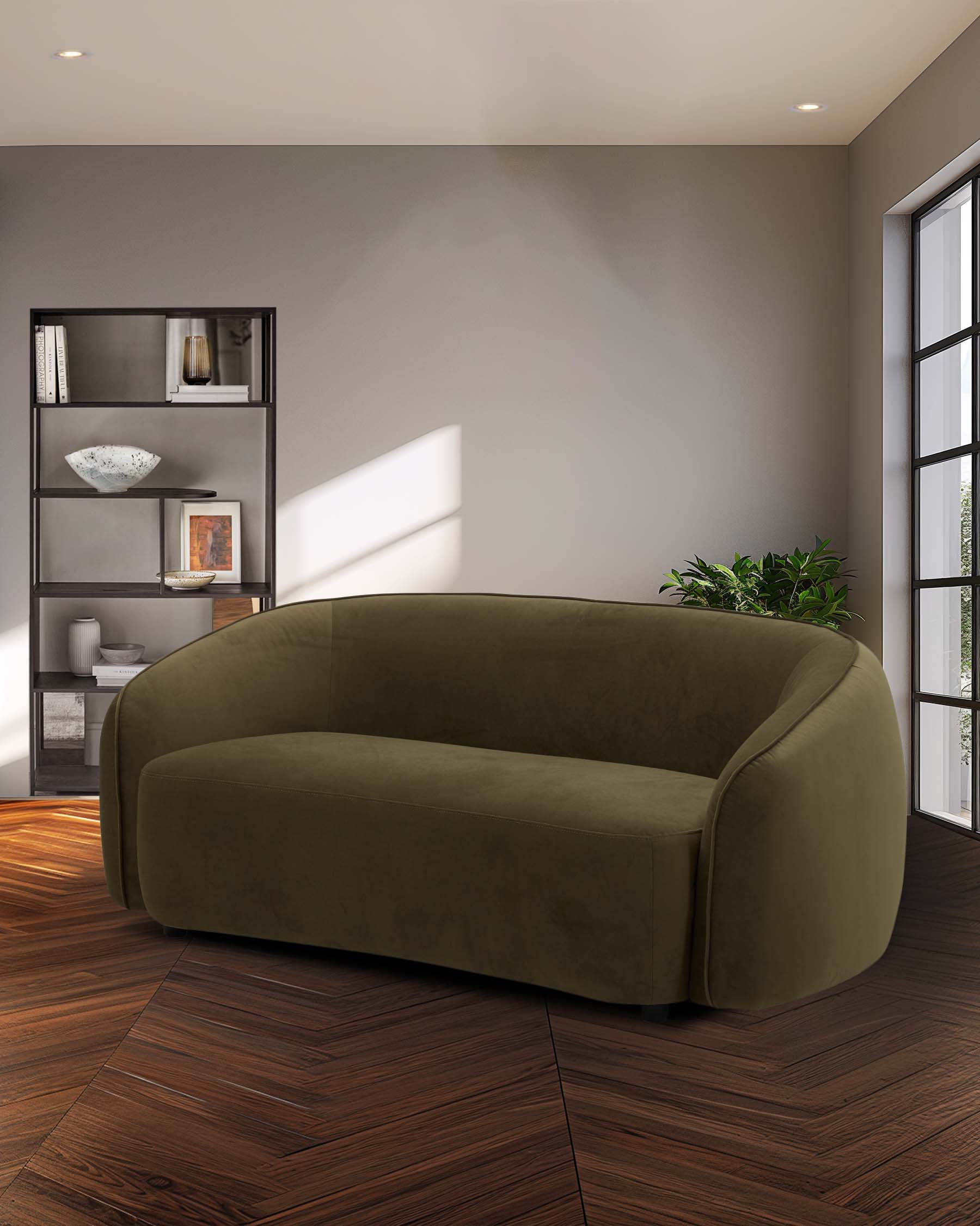 The Zoey olive green velvet 2 seater sofa brings sophisticated comfort to your living space with its organically rounded shape and luxurious recycled velvet upholstery. Perfect for intimate conversations or quiet evenings, this contemporary piece features gently tapered arms and removable back cushions for a deeper, more relaxed sit. Built on a robust webbed frame with a 10-year warranty, it's designed for years of gatherings.