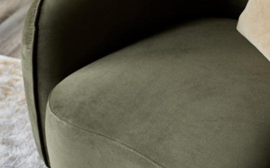 Thoughtfully designed for the moments that matter, the Zoey olive green velvet armchair brings sophisticated comfort to your space. Its generous curves and plush recycled velvet upholstery create an inviting retreat for reading, relaxing, or quiet conversations. The rich olive green adds warmth whilst the removable back cushion offers versatile comfort options for every occasion.