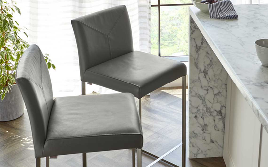 The Monti bar stool brings sophisticated comfort to your kitchen island or home bar. Upholstered in supple dark grey real leather with subtle stitching details, this fixed-height stool sits on a sleek stainless steel frame. Perfect for morning coffee or evening gatherings, its cushioned seat ensures comfort through long conversations.